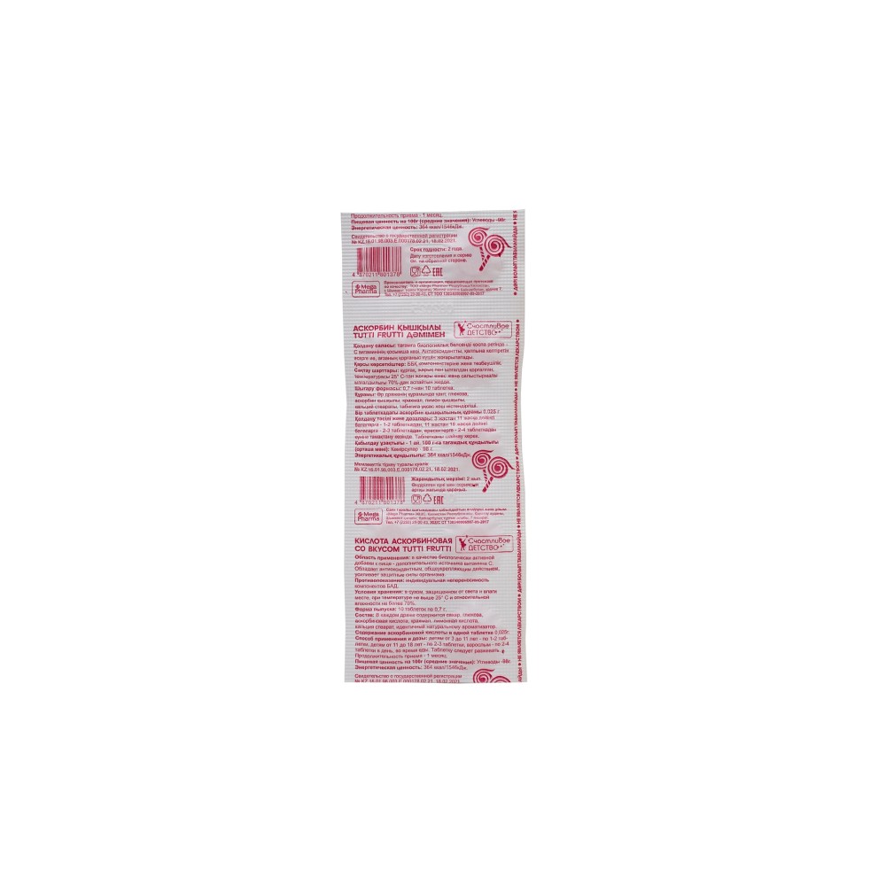 Аскорбиновая кислота "Счастливое детство" со вкусом Tutti Frutti, 10 таблеток (Конвалюта)
