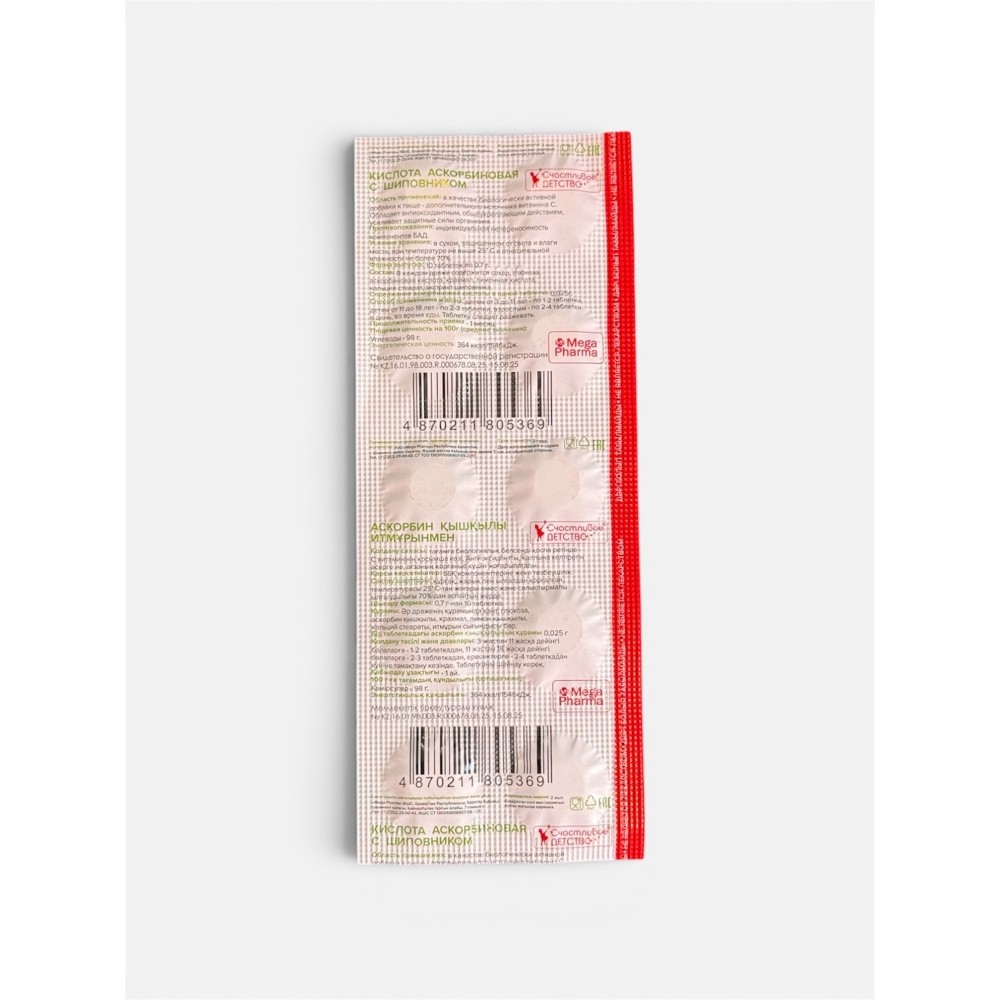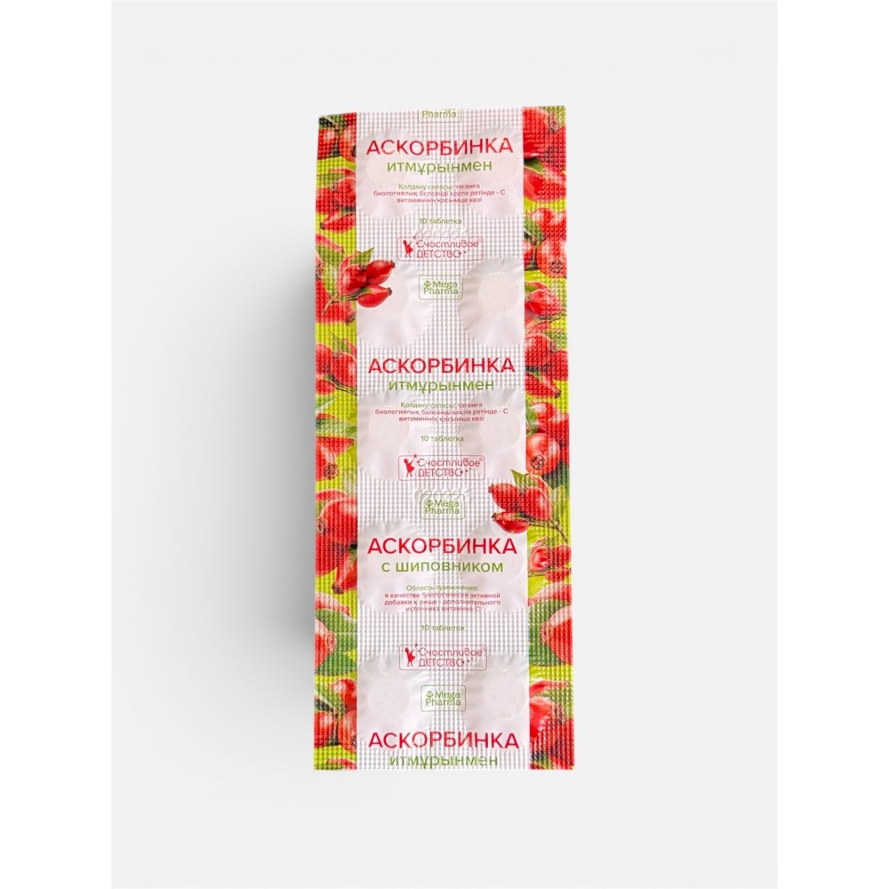 Аскорбиновая кислота "Счастливое детство" со вкусом шиповника — это вкусные жевательные таблетки, которые помогают поддерживать защитные силы организма и поднимают настроение.